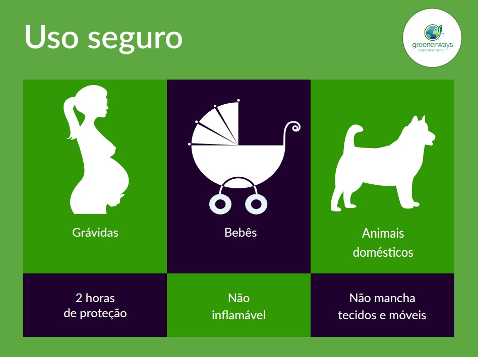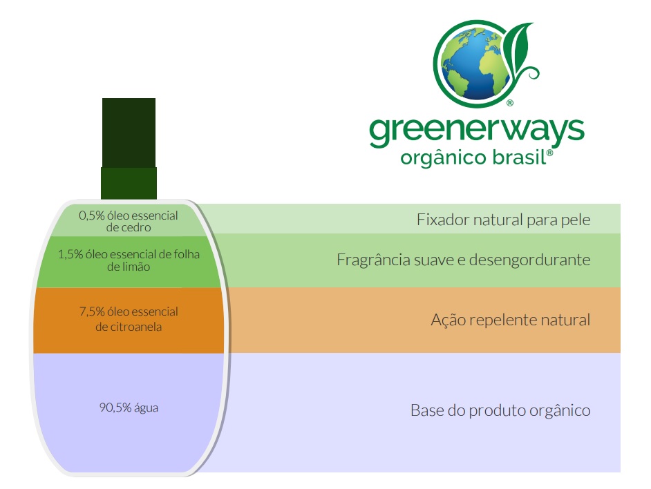 O primeiro repelente de insetos orgânico e natural do Brasil, com 7,5% de óleo essencial de Citronela, associado ao óleo essencial de folha de limoeiro e cedro, tendo água como base. Graças à sua formulação rica em citronela, oferece 2h de proteção contra insetos.